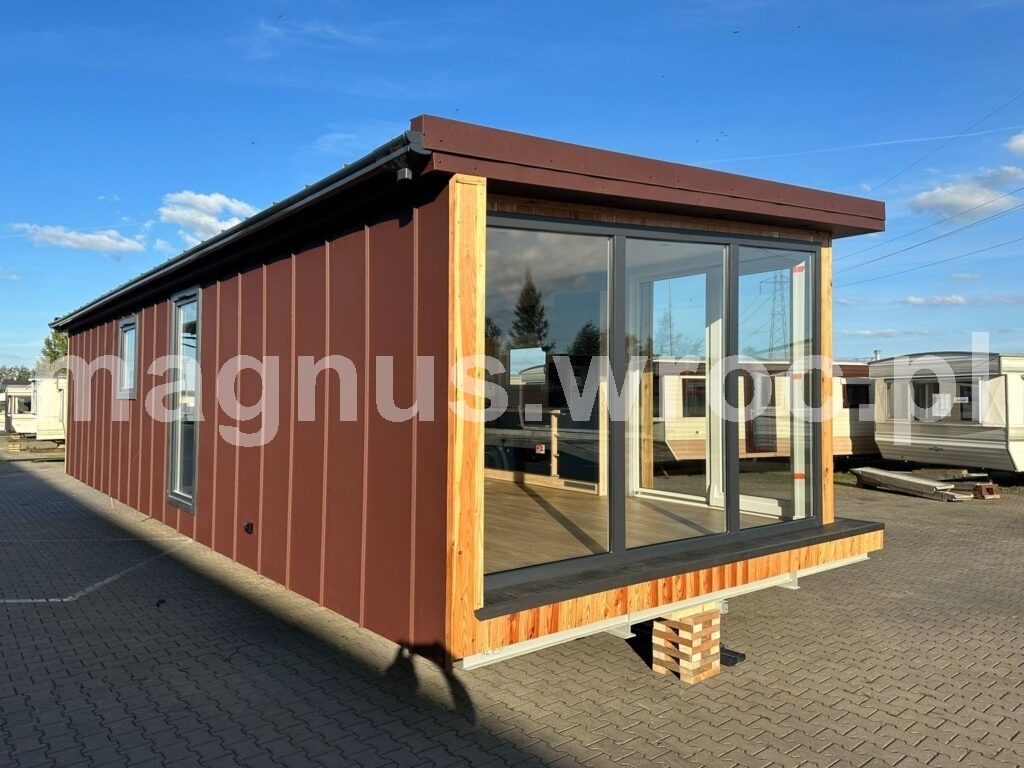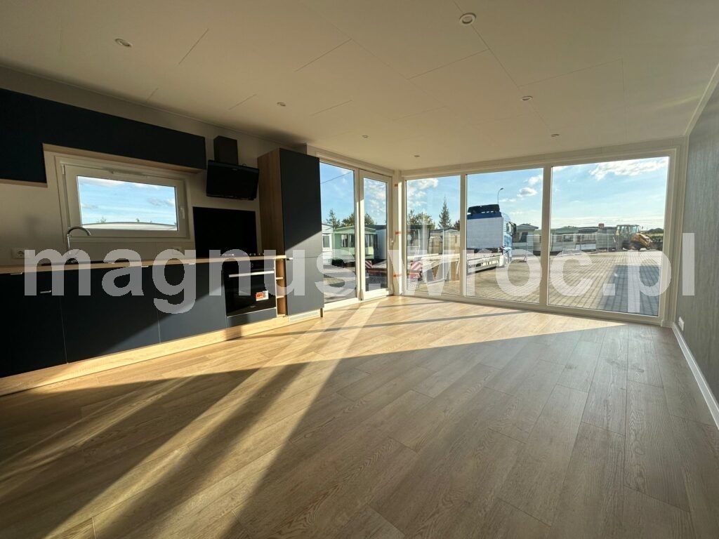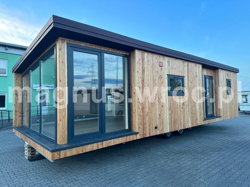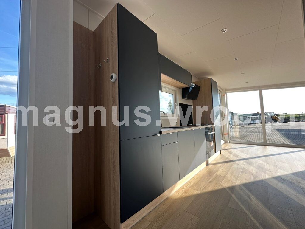 Ten konkretny model ma 47,3 m2 powierzchni zabudowy, wykładzinę winylową i ogrzewanie podłogowe (z możliwością wyboru kotła gazowego lub elektrycznego). Posiada izolacje ścian 70 mm, dachu oraz podłogi 1o0 mm, blachę elewacyjną z drewnem, okna dwuszybowe oraz podwozie stalowe 2-osiowe z materiału IPE 270.