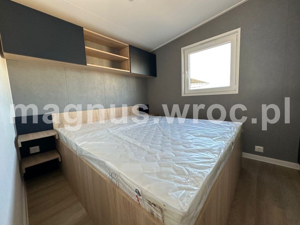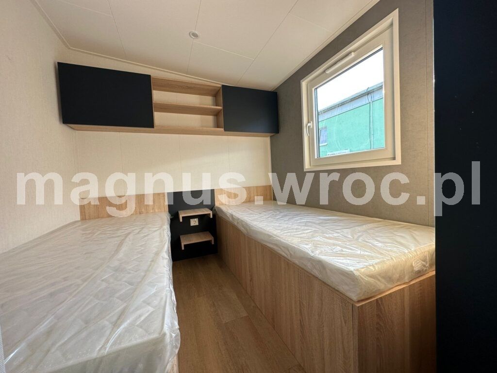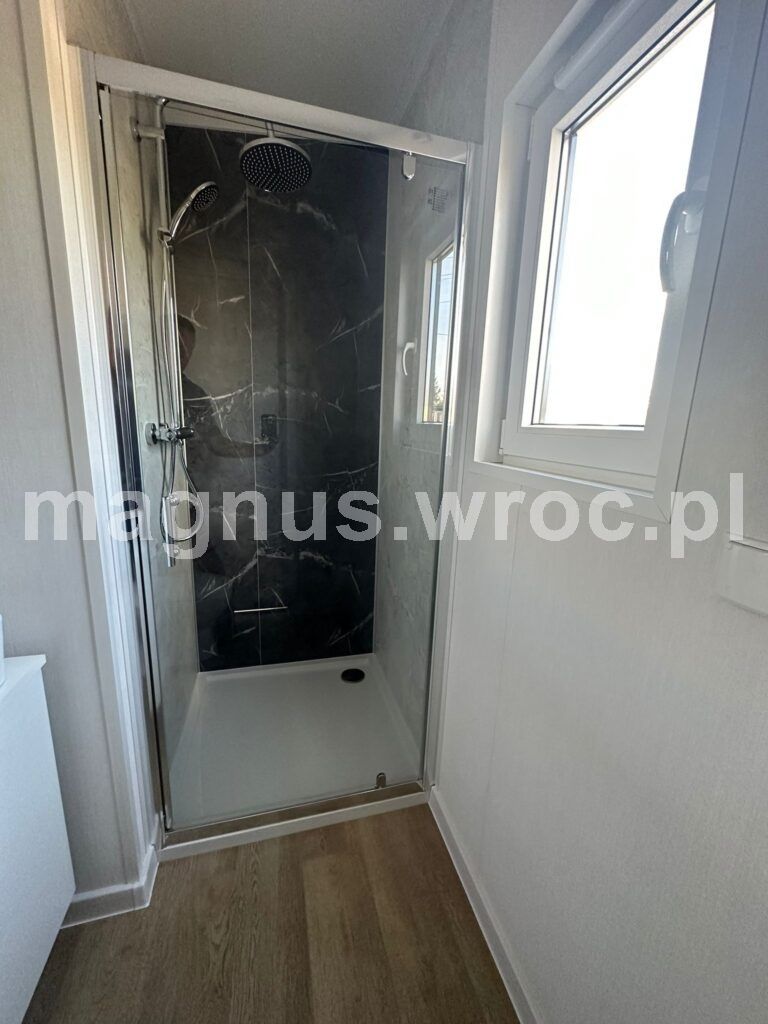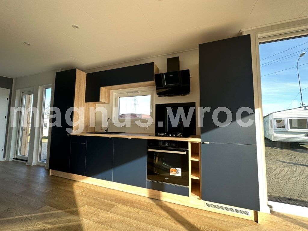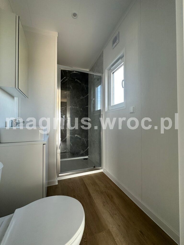 Ten konkretny model ma 47,3 m2 powierzchni zabudowy, wykładzinę winylową i ogrzewanie podłogowe (z możliwością wyboru kotła gazowego lub elektrycznego). Posiada izolacje ścian 70 mm, dachu oraz podłogi 1o0 mm, blachę elewacyjną z drewnem, okna dwuszybowe oraz podwozie stalowe 2-osiowe z materiału IPE 270.