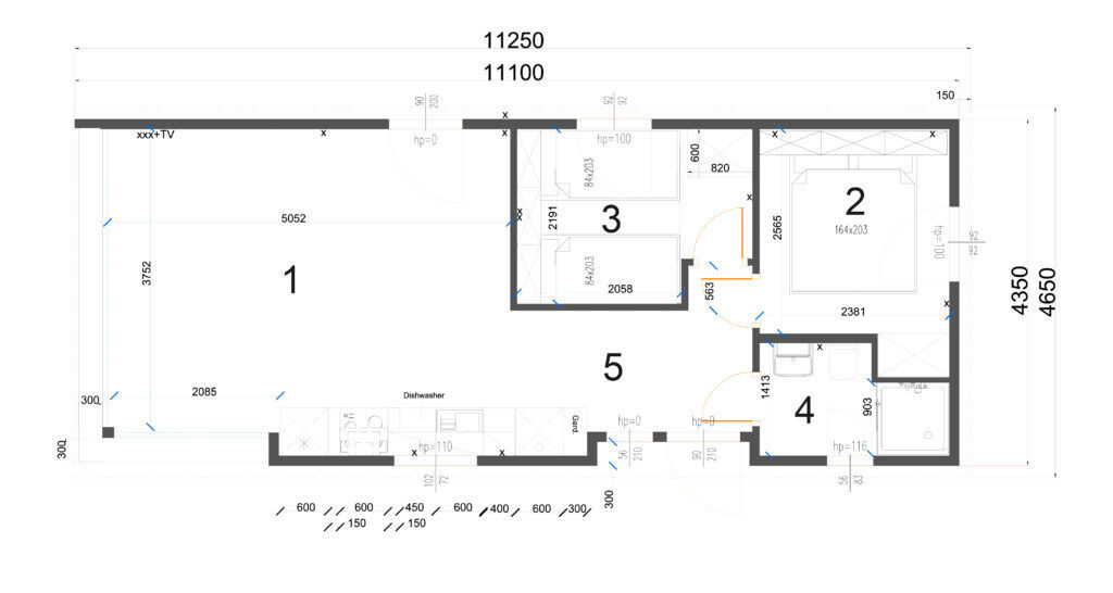 - sypialnia ( 5,8 m2 ) z dwoma łóżkami pojedynczymi, szafkami wiszącymi, szafą w zabudowie oraz szafkami nocnymi;